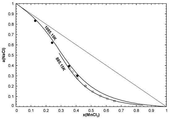Calculated activity of NaCl (relative to liquid standard state) in the NaCl-MnCl liquid at 885.15 K and 1085.15 K, along with experimental data from Østvold [28] (, 885.15 K; , 1085.15 K) —reprinted from [19] with permission from Elsevier.