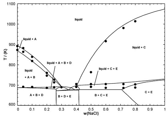 Calculated (predicted) section of the NaCl-MgCl-CaCl-MnCl phase diagram at constant mass ratio MgCl/CaCl/MnCl = 1/1/1 along with measurements from Il’ichev and Vladimirova [30]. Notations: A = MgCl-MnCl(ss), B = CaCl-MgCl(ss), C = NaCl-CaCl(ss), D = Na(Mg, Ca, Mn)Cl(ss), E = Na(Mg,Mn)Cl(ss)—reprinted from [19] with permission from Elsevier.