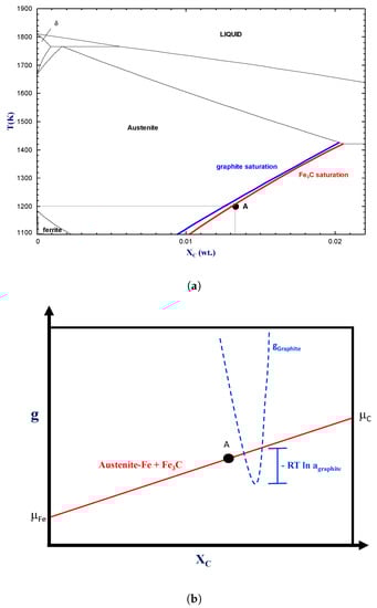 (a) iron-rich part of the Fe-C phase diagram calculated using the FactSage FSstel database; (b) schematic of the Gibbs free energy hyperplane (i.e., the common tangent defining the Fe + Fe3C metastable equilibrium) evaluated at point A at 1200 K presented in the Fe-C phase diagram. The dashed line defines the Gibbs free energy of graphite and allows the evaluation of its activity.