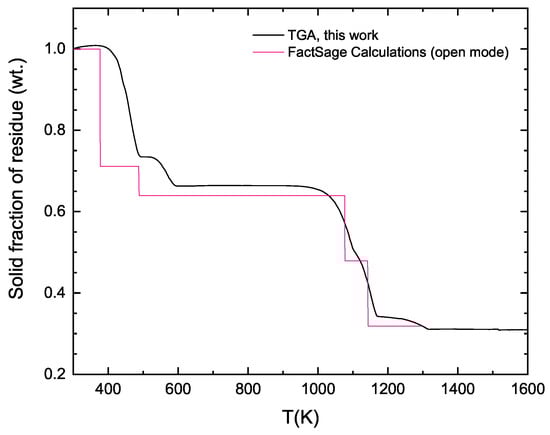 We also present in this figure thermodynamic simulations performed using the FactPS (pure substances) database of FactSage in the open calculation mode. This type of calculation proceeds as follows: an imposed amount of gas is first introduced into the system. This gas phase is then allowed to equilibrate with the solid to be thermally decomposed at some imposed temperature and pressure. Finally, the equilibrated gas phase is removed from the system and the process is repeated until the final conditions are reached.