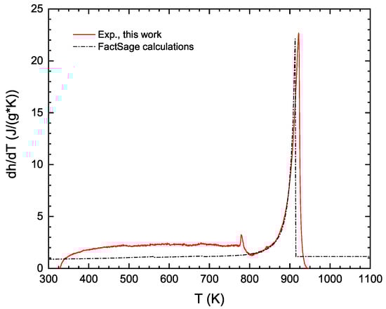 In theory, it is possible to predict this DSC signal from standard NPT thermodynamic calculations as it is directly related to the isobaric heat capacity of the system. Figure 10 plots the evolution of as a function of temperature as predicted from the FactSage FTlite database that is specifically developed to explore the thermodynamic behavior of aluminum alloys. We predict with this database a liquidus temperature of the 2024 alloy at 915.05 K, which is 7 K below the measured value obtained with a DSC-rod. It is to be noted that other transitions in the solid phase occur below the liquidus temperature (see Table 3). The corresponding signals are not detected because the enthalpy changes associated with the transitions are relatively small, as predicted by the calculated evolution.