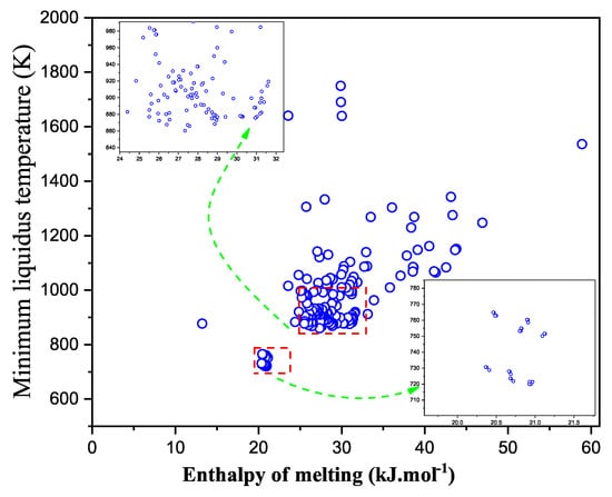 To illustrate the strength of the FactOptimal software module, we present two examples with potential applications here. The first example is the identification of all local minima on the liquidus surface in multicomponent systems. Local minima on liquidus surface can be eutectics, simple minima (azeotrope-like), or saddle points. The knowledge of such special compositions has many industrial applications: solders, heat storage materials, transfer media, or casting fluxes. The FactOptimal methodology allowing the determination of local minima on the liquidus surface of multicomponent systems has been presented in our prior works [34,38] and will not be repeated here. All local minima in the LiF-NaF-KF-MgF-CaF-SrF-BaF system have been calculated. A total of 183 local minima on the liquidus surface were identified, including all subsystems (unaries, binaries, ternaries, etc.) of the seven-component system. In Figure 11, the minimum liquidus temperatures of all identified compositions are represented as a function of their corresponding enthalpy of melting. Each point represents a different composition with different properties. The absolute minimum liquidus temperature for this system is 720 K (447 C) while the maximum enthalpy of melting is 60 kJ/mol. Although the general trend is a linear increase of the enthalpy of melting with liquidus temperature, a large dispersion is observed.