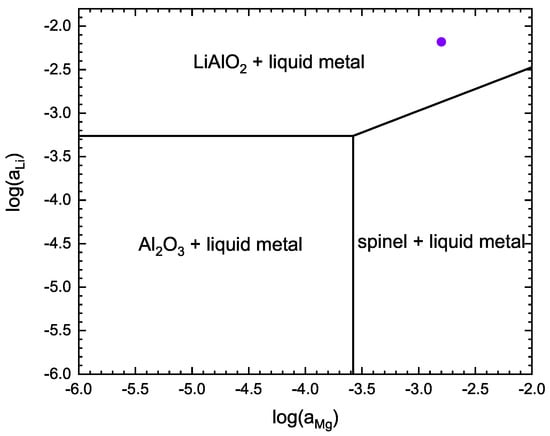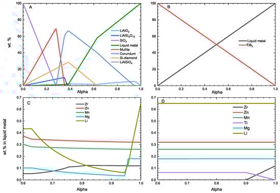 We explore in Figure 13 the behavior of two crucible candidate materials, i.e., SiO and TiB. These materials are exposed to a varying quantity of the AA2027 liquid alloy at 1068.15K. The thermodynamic calculations performed in this figure assume that the interactions between the liquid metal and the refractory materials are not diffusion-limited (i.e., the imposed mass balances are respected). As expected from the Ellingham diagram, SiO is not a good candidate to contain liquid aluminum since silicon is more noble than Al. Consequently, any small quantity of SiO will react with the liquid alloy to form AlO while transferring silicon to the liquid metal. In this specific example, the presence of lithium, a reactive and fast-diffusing metal, leads to the formation of another corrosion product, LiAlO. Lithium depletion in the liquid alloy occurs as soon as it is in contact with SiO. The behavior of TiB is completely different. According to Figure 13, this material is almost completely inert toward this liquid aluminum alloy. In fact, the only reaction that occurs is zirconium transfer from the liquid alloy to the TiB material combined with a transfer of titanium to the melt (Figure 13D).