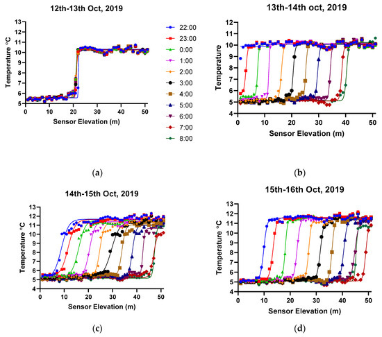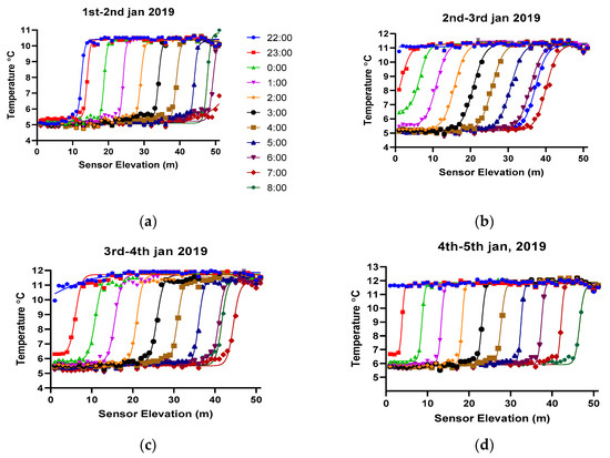 Curve fitting was employed to find the set of parameter values of the function that best approaches the collected data. This thus minimizes the deviation between the observed and expected temperature values of each sensor. For this purpose, the commercial software GraphPad prism was used for its analysis. Hourly plots of different times of the year (1st–7th January to 12th–19th October 2019), which represent the fitting profile of the temperature distribution of the charging cycle, were analyzed on the software and are presented in Figure 3a–f and Figure 4a–f.