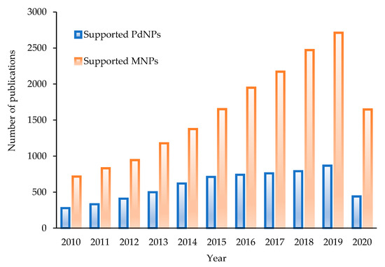 Rising interest on the development of supported palladium nanoparticles (PdNPs) and metallic NPs (MNPs). Topics: (metal nanoparticles and supported and catalysis. Analysis: publication years: (2010 to 2020) and research areas: (chemistry, materials science, science technology other topics, engineering, physics, energy fuels, electrochemistry, environmental sciences, ecology, polymer science). Source: ISI Web of Knowledge, accessed on 25, July 2020.