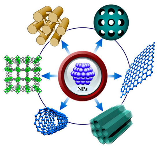An enhancement of the catalytic efficiency requires improvement in the activity and selectivity. Immobilized catalysts benefit from an increase of the surface and porous volume of the composite that effectively can enhance both activity and selectivity in heterogeneous systems [15,16,17]. The selection of a suitable stable solid support is the most important step for MNPs immobilization (Figure 2). Distinct approaches for the preparation of effective and recyclable PdNPs catalysts have been reported in the literature, involving a large variety of solid supports, as carbon-based materials [7,18,19], silicas [20,21,22], metal organic frameworks (MOFs) [23,24,25], zeolites [26,27,28], and also metal oxides, polymers, or magnetic composites [1,29], among the most used.
