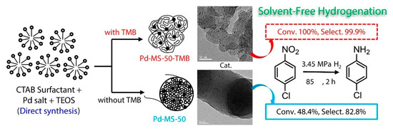 Preparation of Pd-mesoporous silicas (MS) catalysts and major catalytic outcomes for the solvent-free application to hydrogenation of p-chloronitrobenzene. Reproduced with permission from Yu et al., Chemical Engineering Journal; published by Elsevier B.V., 2017.