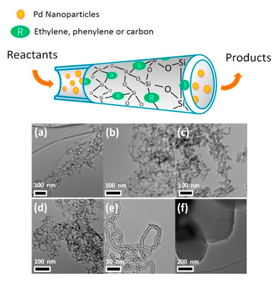 In 2017, Sun and colleagues reported the preparation of MS-based nanotubes supported PdNPs [41], using different framework structures, as organic groups and carbon/silica hybrids. The synthesis of silica nanotubes (SNT) containing ethylene or phenylene groups, E-SNT and B-SNT, respectively, was performed in accordance with a previously method reported by the authors with minor modifications (Figure 4, top) [42]. The authors used a much lower surfactant concentration than that used for the synthesis of SBA-15, which was advantageous to obtain a rod-like micelle formation. The carbon-doped silica nanotubes E-CS-NT and B-CS-NT were carbonized at 800 °C in N2 atmosphere for 2 h (CS: carbon/silica hybrid). In addition, the pristine (SNT) and SBA-15 were also synthesized. The nanotube morphology of E-SNT and B-SNT, was maintained after calcination although narrower diameters were observed. PdNPs were uniformly dispersed in the distinct nanotubes by means of an impregnation-reduction process.