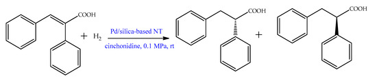 The catalytic performance of the silica-based nanotubes loaded PdNPs towards the hydrogenation of α,β-unsaturated carboxylic acids was investigated in the presence of the chiral modifier cinchonidine (Figure 5), achieving a conversion of 99% of α-phenyl cinnamic acid within 10 h at room temperature, and H2 pressure of 0.1 MPa for encapsulated PdNPs in the B-SNT, E-SNT, and E-CS-NT, respectively (Table 2).
