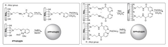 Synthetic procedure of APPd(0)@Si and BPPd(0)@Si. Reproduced with permission from Shabbir et al., Journal of Organometallic Chemistry; published by Elsevier B.V., 2017.