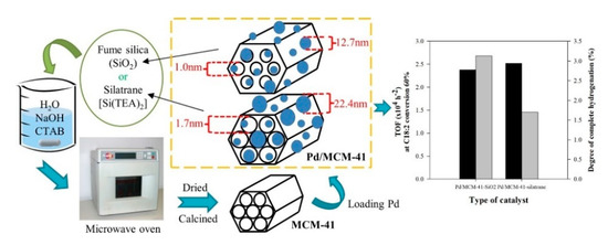 Rungsi and colleagues explored the influence of the silica source used on the hydrothermal preparation of MCM-41, followed by PdNPs impregnation on the mesoporous MCM-41 supports [45] and application in the catalytic partial hydrogenation of soybean-derived polyunsaturated fatty acid methyl esters (FAMEs), as displayed in Figure 7. The microwave-assisted synthesis of mesoporous MCM-41 silica, using fumed silica (SiO2) and silatrane (Si(TEA)2) as silica sources, significantly shortened the hydrotreatment time. MCM-41 product has shown much higher values regarding its textural parameters, as MCM-41-SiO2 support and MCM-41-silatrane, than reported elsewhere [46].