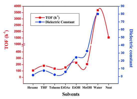 The enhanced catalytic activity observed for Pd/SBA-COOH is most likely due to the highly dispersed smaller-sized PdNPs. A synergistic effect is observed between the SBA-COOH support and its textural parameters, as previously reported in the literature [51]. The hydrogenation reaction of nitrobenzene showed much lower efficiencies in various organic solvents than that obtained under solvent-free conditions (Figure 8).