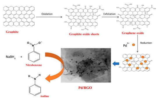 In 2015, a new one-pot synthesis approach for the synthesis of PdNPs/reduced graphene oxide (RGO) nanocomposite materials was reported by El-Hout and co-workers [58]. Well-dispersed PdNPs on the graphene sheets were prepared through an in-situ green chemical reduction methodology. The preparation of Pd/RGO implied the sonication of GO in water, followed by addition of Pd(II) acetate to the GO suspension, and subsequent addition of a reducing agent, including oxalic acid, salicylic acid, ascorbic acid, NaOH and hydrazine hydrate, N2H4 (H.H) (Figure 9). The reduction of the oxygenated functional groups and the Pd/RGO structure was corroborated by several techniques.
