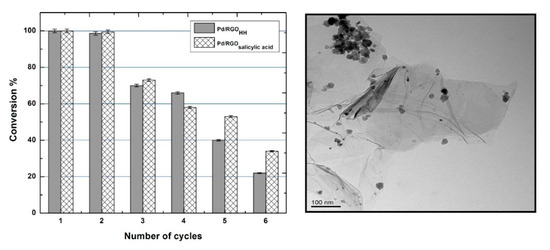 Left: recycling ability of Pd/RGO-H.H and Pd/RGO-salicylic acid catalysts in reduction of nitrobenzene. Right: TEM image of Pd/RGO-salicylic acid catalyst after the 6th run. Reproduced with permission from El-Hout et al., Applied Catalysis A: General; published by Elsevier B.V., 2015.