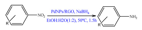 The prepared PdNPs/RGO was tested as heterogeneous catalysts for the reduction of nitroaromatic compounds by NaBH4 in an environmentally friendly medium (Figure 12). Firstly, the reduction of nitrobenzene to aniline was used to evaluate the activity of the PdNPs/RGO. High aniline yields, up to 98%, were obtained at 50 °C, with significant conversions. The authors also studied the influence of the nature of the substituents, through the reaction of different nitroarenes, reporting remarkable and robust activity, with good to excellent yields for a wide range of substrates. The gathered data showed that halogen-substituted nitroarenes were selectively reduced to their corresponding halo anilines products in high yields. Nitroarenes containing carbonyl groups also afforded very good yields of the respective products.