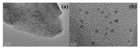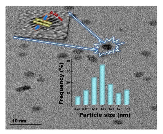 Aiming for enhanced chemical selectivity in the hydrogenation of nitro compounds, Bilgicli et al. recently described the easy synthesis of a new monodisperse composite of PdNPs and GO, denoted as CPG [62]. The synthesis of CPG consisted of a mixture of PdCl2 and GO in ethanol, and further addition of a NaBH4 solution. The PdNPs were found to be homogeneously distributed over GO, presenting a mean particle size of 3.86 nm (Figure 14). XPS studies revealed the presence of metallic Pd and a small amount of Pd(II) species, the latter probably related to the oxidized species of Pd.