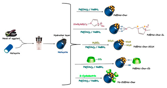 In 2019, a novel halloysite-hydrochar (Hal-Char) nanocomposite was prepared by Sadjadi et al. and used as a support for PdNPs, delivering efficient catalysts for the hydrogenation reaction of nitroarenes [63]. A domestic biomass, the green head of eggplant, was chosen as the source of the hydrochar, being deposited as a layer on a halloysite via hydrothermal treatment, obtaining thus a nanocomposite, which was then employed for the immobilization of PdNPs and development of Pd@Hal-Char. The schematic procedure for the preparation of the catalysts is presented in Figure 15.