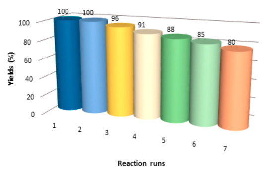 The authors highlighted the importance of the RGO support towards the enhancement of the catalytic performance. Overall, the proposed method presented several advantages as high product yields, simple preparation of catalyst, simple methodology, and easy work up. The catalyst can be considered environmental-friendly, being recovered, and reused in five catalytic cycles without losing its activity [59].