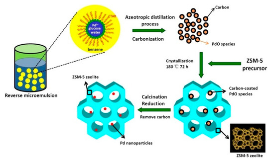 - Cui, T.L.; Ke, W.Y.; Zhang, W.B.; Wang, H.H.; Li, X.H.; Chen, J.S. Encapsulating Palladium Nanoparticles Inside Mesoporous MFI Zeolite Nanocrystals for Shape-Selective Catalysis. Angew. Chem. -Int. Ed. 2016, 55, 9178–9182. [Google Scholar] [CrossRef]