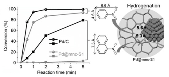 The influence of a structure-directing agent, 1,3,5-trimethylbenzene (TMB) on the in-situ incorporation of PdNPs within MS was explored by Yu and colleagues [38]. Pd-MS catalysts were synthesized, with and without the addition of TMB, by the direct synthesis method with Pd incorporated in MS, under basic conditions (Figure 3). The average sizes for PdNPs obtained by the direct synthesis method were much smaller (2.4–4.3 nm) than those synthesized by a post-synthetic deposition method (17.7 nm for Pd/(MS-50)), as confirmed by Transmission Electron Microscopy (TEM).