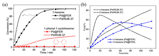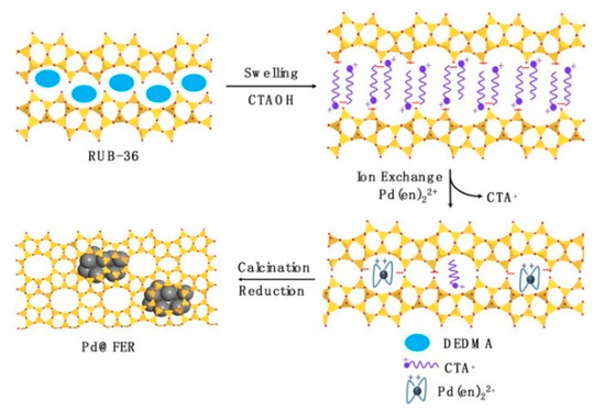- Zhao, Z.; Li, Y.; Feyen, M.; McGuire, R.; Müller, U.; Zhang, W. Pd Nanoparticles Encapsulated in FER Zeolite through a Layer Reassembling Strategy as Shape-selective Hydrogenation Catalyst. ChemCatChem 2018, 10, 2254–2259. [Google Scholar] [CrossRef]