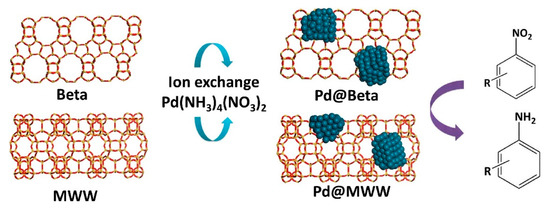 - Zhang, J.; Wang, L.; Shao, Y.; Wang, Y.; Gates, B.C.; Xiao, F.S. A Pd@Zeolite Catalyst for Nitroarene Hydrogenation with High Product Selectivity by Sterically Controlled Adsorption in the Zeolite Micropores. Angew. Chem.-Int. Ed. 2017, 56, 9747–9751. [Google Scholar] [CrossRef]