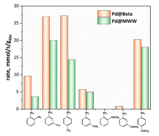 - Zhang, Y.; Fulajtárová, K.; Kubů, M.; Mazur, M.; Hronec, M.; Čejka, J. Electronic/steric effects in hydrogenation of nitroarenes over the heterogeneous Pd@BEA and Pd@MWW catalysts. Catal. Today 2020, 345, 39–47. [Google Scholar] [CrossRef]