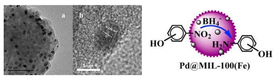- Xu, B.; Li, X.; Chen, Z.; Zhang, T.; Li, C. Pd@MIL-100(Fe) composite nanoparticles as efficient catalyst for reduction of 2/3/4-nitrophenol: Synergistic effect between Pd and MIL-100(Fe). Microporous Mesoporous Mater. 2018, 255, 1–6. [Google Scholar] [CrossRef]