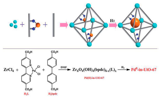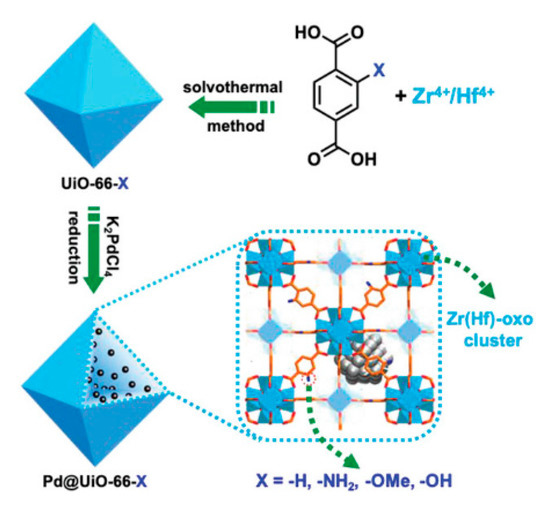 - Luo, S.; Zeng, Z.; Zeng, G.; Liu, Z.; Xiao, R.; Chen, M.; Tang, L.; Tang, W.; Lai, C.; Cheng, M.; et al. Metal Organic Frameworks as Robust Host of Palladium Nanoparticles in Heterogeneous Catalysis: Synthesis, Application, and Prospect. ACS Appl. Mater. Interfaces 2019, 11, 32579–32598. [Google Scholar] [CrossRef]