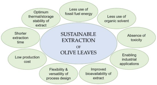 The extraction process, that is the separation of desired (endogenous) ingredients, requires careful selection of methodologies. This is partly because unlike synthetic antioxidants, a great challenge is involved for the recovery of natural ingredients [91]. Although synthetic antioxidants confer efficiency and stability, by reason of being potentially hazardous, e.g., developing carcinogenicity and toxicity, the use of natural antioxidants is viewed as a safer and more appealing alternative [92]. The extraction system should be ideally designed to effectively satisfy processing, economics, and environmental sustainability. The main features associated with the sustainable extraction of functional ingredients from olive leaves are highlighted in Figure 1.