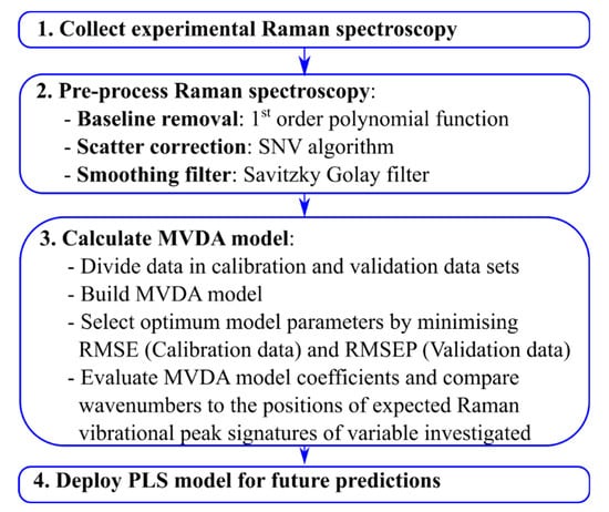 Raman spectroscopy model generation workflow defining the primary steps to ensure that a robust MVDA model is generated. SNV = standard normal variate, RMSE = root mean square, and RMSEP = root mean square error of prediction, MVDA = multivariate data analysis.