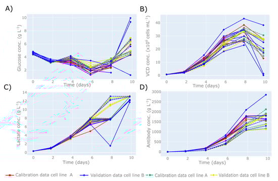 Time series plots of off-line analytics recorded on a micro-bioreactor system for (A) glucose concentration, (B) viable cell density (VCD) concentration, (C) lactate concentration, and (D) antibody concentration. Cell line A is indicated by the solid lines with the red lines and squares representing the calibration cell cultures: 1–5 and 7–11. The validation runs are indicated by the blue lines with diamonds, and represent cell cultures 6 and 12. Cell line B is indicated by the dashed lines with the green lines and squares representing the calibration cell cultures: 13–17 and 19–23. The validation runs are indicated by the yellow lines with diamonds and represent cell cultures 18 and 24. The micro-bioreactor system had 24 parallel bioreactors with an initial working volume of 13.5 mL, operated using a pH set-point of 7, DO2 concentrations of between 10–40%, and a temperature maintained at 35.5 °C.