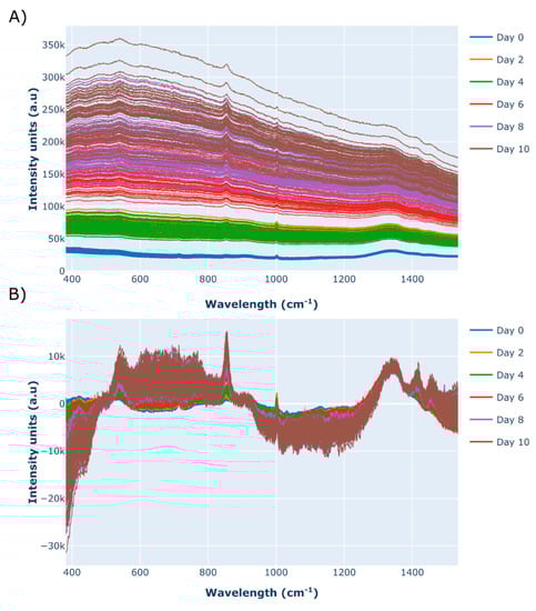 Raman spectra recorded by the high-throughput Raman spectroscopy microscope for each of the 24 micro-bioreactor cell culture runs on day 0–10 shown in the form of (A) the raw spectral data and (B) the baseline-corrected spectra, using a 1st order polynomial function followed by the application of a standard normal variate (SNV) scattering scatter algorithm and a Savitzky–Golay smoothing filter. Each spectrum was generated using 5 accumulations each with a 30 s acquisition time, recorded using 10% laser power (30 mW).