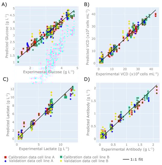 Parity plots demonstrating the prediction performance of four separate PLS models, highlighting the calibration and validation data sets of cell line A and B for (A) glucose concentration, (B) viable cell density (VCD), (C) lactate concentration, and (D) antibody concentration. Four separate PLS models were built utilising 7 latent variables for each variable investigated, and calibrated using cell culture runs 1–5 and 7–11 from cell line A (indicated by the red squares) and runs 13–17 and 19–23 from cell line B (indicated by the green squares). The model was validated using cell culture runs 6 and 12 from cell line A (indicated by the blue diamonds) and runs 18 and 24 from cell line B (indicated by the yellow diamonds). The spectral data utilised in each PLS model were baseline-corrected spectra using a 1st order polynomial function, followed by the application of an SNV scattering scatter algorithm and a Savitzky–Golay smoothing filter.
