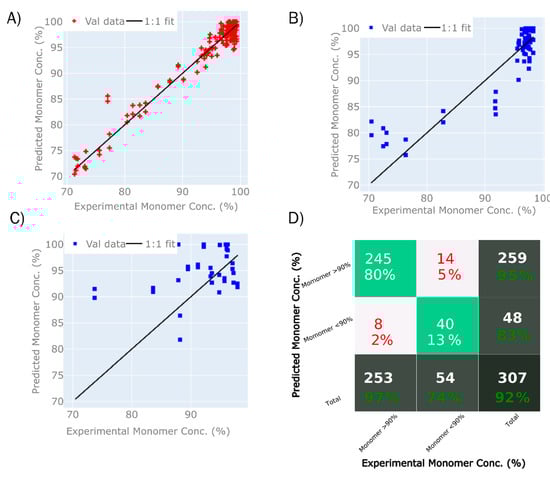 For glucose, the dominant regression coefficients were characterised by peaks that had a regression coefficient equal to or above 0.2 (i.e., ). Wide peaks were characterised by the start, max, and end wavenumber of these peaks and by the max wavenumber value for narrow peaks. The majority of these peaks are shown to correctly align with the peaks associated with glucose, based on previously published literature defining the wavenumbers associated with glucose [62,63,64,65,66,67,68]. This includes the three distinct peaks in the 871–988 cm−1 range, which are indicated in Figure 5A as a single peak at wavenumber 928 cm−1, which aligns with multiple literature references for the specific Raman scattering bands associated with glucose. The other dominant peaks at 1373, 1061, and 517 cm−1 all align with the expected peaks for glucose and further strengthen the predictions of the generated PLS model. Another interesting observation was outlined by Söderholm et al. [64], who demonstrated a small peak shift of approximate 2–5 wavenumbers depending on the glucose concentration in an aqueous solution with varying water contents; this demonstrates why, in Table 2, some of the regression peaks do not align precisely with those quoted in the literature. An additional evaluation of specific Raman bands for individual metabolites was defined by Singh et al. 2015 [65], who investigated the supernatants of a CHO cell culture grown in shake flasks using a Raman spectroscopy device. They used a classical least squares algorithm to determine, with a high degree of accuracy, the specific bands associated with both glucose and lactate. For glucose, they determined that there are seven characteristic peaks related to glucose, which are located at the wavelengths 435, 516, 990, 1076, 1121, 1374, and 1460 cm−1, which all align with the dominant PLS regression coefficients features shown in Figure 5A. The alignment of these PLS regression coefficients with the expected Raman peaks of glucose provides additional confidence in this generated MVDA model. Similar observations were observed for the main regression peaks of lactate shown in Figure 5C that were highlighted for all the PLS regression coefficients above 0.05 (i.e., ). The majority of these bands correspond to the Raman vibrational bands characterising lactate in the literature, as demonstrated in Table 2. Furthermore, Singh et al. characterised the main lactate-associated Raman peaks by wavenumbers 855, 922, 1045, 1085, and 1456 cm−1, which align almost perfectly with those shown in Figure 5C. Similar to the glucose model, the correct alignment of the PLS regression coefficients with the expected lactate vibration bands provides the necessary confidence in the PLS model to enable subsequent predictions and deploy the MVDA model.