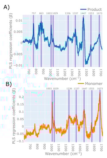 The PLS regression coefficients of VCD are shown in Figure 5B, with the main peaks identified as those above 0.02 (i.e., ), which are also indicated in Table 2. It is interesting to note that the primary peaks identified are also closely associated with the expected Raman vibrational bands of lactate. These highly correlated metabolite concentrations are problematic, as, although the RMSE and RMSEP of this PLS model are low, it is difficult to deconvolute this strong association with lactate. The correlation coefficient between the off-line lactate and off-line VCD concentrations was equal to 0.88, and therefore would help explain the location of these dominant lactate peaks corresponding to the calculated VCD regression coefficients. This is particularly evident when comparing the dominant lactate PLS regression peak shown at wavenumber 855 cm−1 in Figure 5C, which corresponds to the strong peak shown in the VCD at this precise wavenumber shown in Figure 5B. This high correlation is most likely due to the high accumulated lactate on days 6, 8, and 10, shown in Figure 2C, which resulted in a significant drop in the corresponding VCD values shown in Figure 2B. Based on a subsequent analysis of the PLS regression coefficients, it would be recommended to not deploy this PLS model for VCD and to generate additional experiment runs that do not result in a strong correlation between the off-line analytics of VCD and lactate.