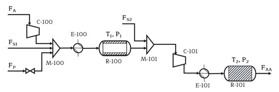 Process flow diagram of the two-reactor section of the production of acrylic acid.