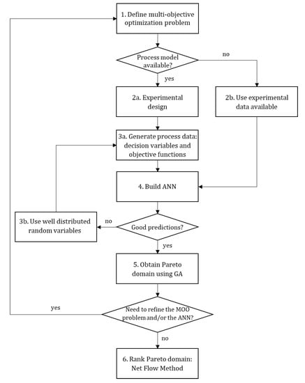 The proposed methodology comprises six main steps, as illustrated in Figure 3. The optimization problem is first established (Step 1) by defining the set of objective functions to be minimized or maximized, and the set of decision variables (with their respective allowable ranges). Building a representative model to perform the optimization study in a timely manner relies on the data set obtained experimentally or through a comprehensive model of the process (Step 2). To obtain the most suitable set of data, an experimental design is usually adopted to gain maximum information with a minimum number of experiments. This is particularly important when solving the comprehensive model or doing experiments is very time-consuming. In this investigation, uniform design (UD) was adopted as a first approach to determine the process data (Step 3) required to build the meta-model of the process using ANN (Step 4) from the phenomenological model. Once the surrogate model is built, which consists of one ANN for each objective function, it is used to circumscribe the Pareto domain (Step 5) using a genetic algorithm. In this investigation, a large initial population of 5000 individuals was used. Upon analysis of the prediction performance of the ANNs, possible refinement of the optimization problem is considered, such as adjusting the ranges of the decision variables. Initially, the ranges of the decision variables could be larger to ensure a wide range of operation is encompassed. However, when identifying the initial Pareto domain, some ranges of the decision variables could be reduced to ensure more precision for the meta-model. Usually, it would be necessary to return to Step 1, because many data points in the data set used to generate the initial meta-model contains points outside the region of search. Finally, all Pareto-optimal solutions are ranked (Step 6) using the net flow method (NFM) where the preferences of a decision maker are embedded in relative weights and three threshold criteria to assist in the ranking of the Pareto domain. The optimal solution identified based on the ANN and NFM is then corroborated with an actual experiment or via the comprehensive first-principle based model. More details for some of these steps are addressed in the next subsections, where we describe how each step was applied to the optimization of the AA reaction section.