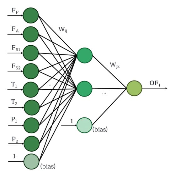 Figure 4 presents the architecture of the FFANN used in this study, which comprises three layers: the input layer, one hidden layer, and an output layer [12]. The input layer is composed of nine neurons; eight neurons corresponding to the decision variables of the MOO problem, and one bias neuron. The only function of the input neurons is to accept the input variables, normalized between 0 and 1, and fan out these scaled input variables to the processing neurons of the hidden layer. The eight decision variables, as defined in Section 3.1, are the molar flowrates of propylene (FP), air (FA) and steam (FS1) to the first reactor, the flowrate of vapor water (FS2) to the second reactor, and the operating temperature and pressure of both reactors (T1, T2, P1, and P2).