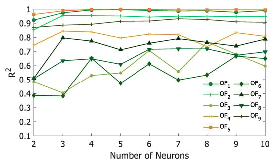 Results of Figure 5 show that some objectives, namely the power of the two compressors (OF1 and OF5) and the heat recovery of the first reactor (OF2), are relatively well predicted. However, the ANNs of the other six objectives show poorer predictions with R2 values below 0.90. Furthermore, it is not possible to observe a clear trend for those OFs when one would expect the R2 value to increase as the number of neurons increases. These results suggest that, for these objectives, the number of design data points is insufficient to allow the ANN to capture the underlying relationships that exist between the decision variables and the objectives. The large number of input variables as inputs to the ANNs also points to the necessity to present the neural networks with richer information. Since the available tables of uniform design are limited to a relatively small number of design points, it was decided to use well-distributed random design points, which offer the possibility of using any desired number of design points.