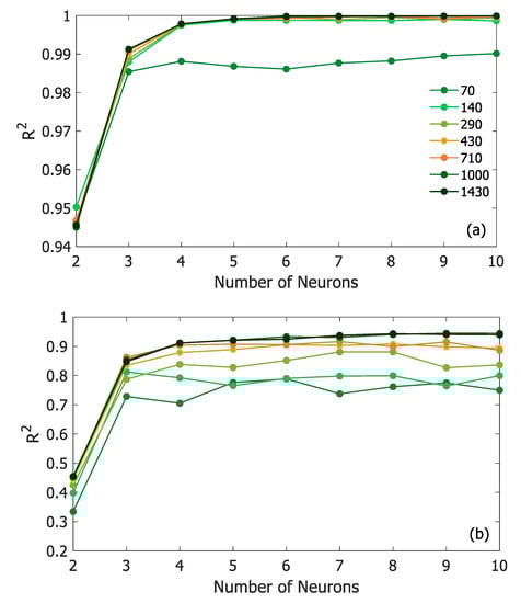 R2 values for different number of random data points used for training and validation vs. Number of neurons in the hidden layer for (a) compression power in C-100 and (b) heat recovery in R-101.