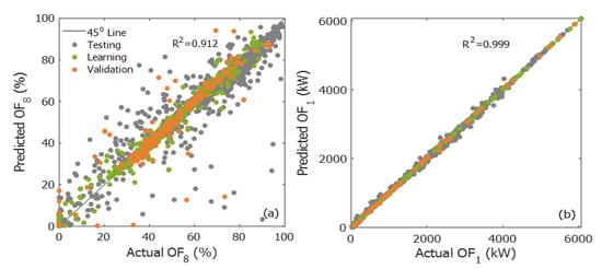 Before proceeding, the quality of the predictions will be examined. Figure 7a,b present the ANN predictions of the conversion of the second reactor (OF8) and the compression power of the first compressor (OF1), respectively, as a function of the values calculated using the phenomenological model. The green points represent the learning data, the orange points correspond to the validation data, and the grey points to the testing data. The testing data were generated using the phenomenological model by randomly selecting the decision variables within their allowable ranges, as defined in Table 2. This data set was used as a “second validation” to confirm the good adjustment and precision of the ANNs when exposed to new input data. As previously mentioned, it had no impact on the meta-model training. The predictions of Figure 7a,b correspond to the ANNs with the lowest and highest R2 values for all data presented: 0.912 and 0.999, respectively. Predictions for the other OFs were very good as well, having R2 values between the two previous values. The predicted conversion in the second reactor (R-101) had the majority of the points near the 45o-line, but with the lowest R2 value due to few scattered points with poor predictions. When examining the sensitivity parameters of Table 3, the two objective functions that are influenced by a larger number of input variables are the conversions of the first and second reactors (OF4 and OF8). As mentioned before, the more an objective function is correlated to a larger number of decision variables, the more learning data points are required to obtain better predictions. As a compromise needs to be made between the R2 value and the number of learning data, a value of R2 above 0.9 was considered a good result.