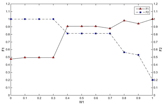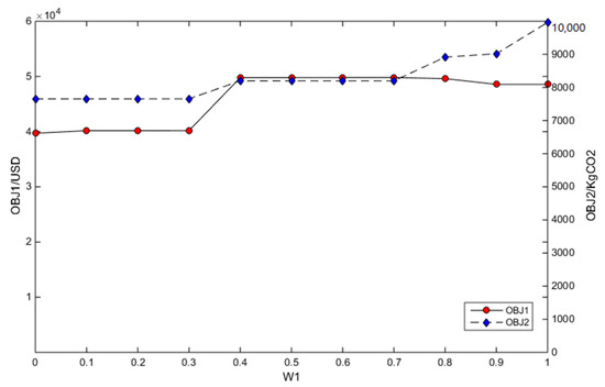 where . and are the weighting factors for each membership function, and the values depend on the importance of economic and environmental aspects. and indicate the membership of and . Due to the different dimensions of the two goals, in order to facilitate comparison, it needs to be normalized, as follows: