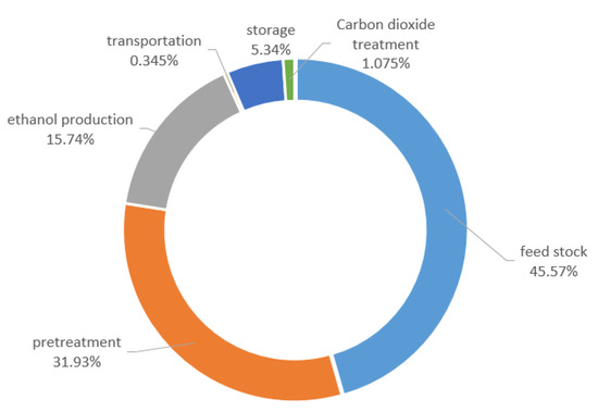 According to the parameters listed in Table 4, Table 5 and Table 6, the optimal cost of raw material procurement, pretreatment, ethanol production, storage, carbon dioxide treatment, and transportation can be obtained, and are presented in Figure 5. In the conventional case, the cost of procuring biomass raw materials accounts for the largest proportion reaching 45.57% of the overall cost, followed by pretreatment of 31.93%. The following two are the cost of ethanol production and storage, which are 15.74% and 5.34%, respectively. Transportation and carbon emission treatment have the least impact on the total cost.