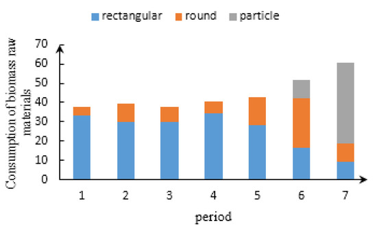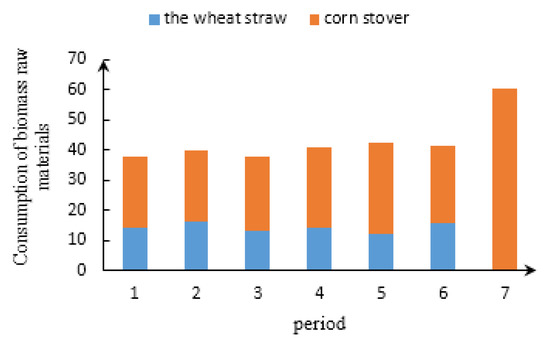 Figure 6 shows the raw materials of wheat straw and corn stover biomass processed by the bioethanol plant at various periods. Bioethanol plants treat corn stalks when they are available, and only select wheat stalks when corn stalks are insufficient. Figure 7 summarizes the amount of raw materials processed by the bioethanol plant in each period. In addition, the price of granulated biomass raw materials is slightly higher than the other two packaging methods, resulting in the bioethanol plant being unable to use the third way of packaging the biomass raw materials.