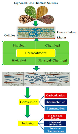 Another aspect of biomass pyrolysis, to enhance the process selectivity for certain products, is the pretreatment process of biomass prior to pyrolysis which can be carried out. Generally, most biomass waste, especially forestry and argo-industrial residues, comprising lignocellulosic biomass, includes three main components, which are named: cellulose, hemicellulose, and lignin. The role of pretreatment is to facilitate biomass conversion by changing the internal structure of lignocellulosic biomass materials by the decrystallization of cellulose and the removal of lignin/hemicellulose [4,13,14]. For this reason, the pretreament of lignocellulosic biomass has been widely applied in the conversion process of biomass into useful components for different industries such as energy, chemical production, food, and pharmaceutical components as can be seen in Figure 1. A wide variety of physical, chemical, and biological pretreatment approaches have been developed and employed in combination to pretreat lignocellulosic biomass [2,4]. A comprehensive discussion about the pretreatment process and its effect on the pyrolysis of lignocellulosic biomass was reported by Zadeh and his team [1].