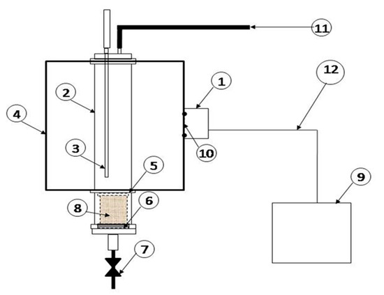 Schematic drawing of the modified microwave oven and the position of the quartz reactor: (1) magnetron; (2) quartz reactor; (3) thermocouple; (4) oven casing; (5) quartz distributor plate; (6) spring for quartz holder fitting; (7) N2 gas inlet; (8) quartz holder fitting; (9) cooler system for magnetron; (10) hole for wave into cavity; (11) gas outlet; (12) electrical connection [28].