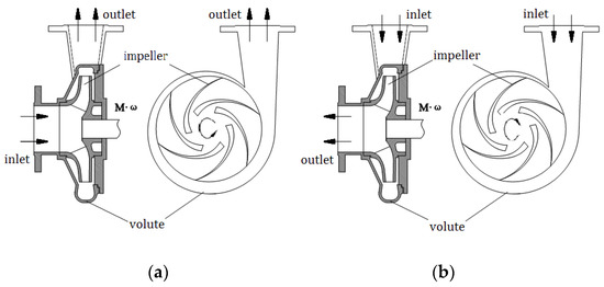In recent decades, pump as turbine (PAT) has drawn increasing attention in energy recovery systems where a high-pressure water source exists. With a pump operating as turbine, the direction of flow and rotation are opposite. For pump, energy is supplied to the fluid via a rotating shaft, as shown in Figure 1a, it is a energy absorbing device. For PAT, energy is extracted from the fluid and output via the rotating shaft, as shown in Figure 1b, it is a energy producing device. Compared with a conventional hydraulic turbine, PAT is simple, inexpensive, easy to maintain, readily available worldwide, and has a short capital payback period. It is an attractive solution for micro-hydro power with capacity below 100 kW [1]. It would be economical to use PAT, recovering the dissipated energy of high-pressure fluids in several hydraulic energy resources, such as water distribution network (WDN) [2,3,4,5], sea water reverse osmosis (SWRO) [6], chemical processes [7], nature falls [8], etc.