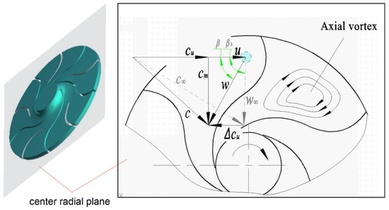 For PAT, the slip phenomenon occurs inevitably in flow passages caused by finite blades. Due to the finite blades with certain thickness of PAT, the fluid in the flow passages is guided weakly, and subsequently a slip velocity Δcu is generated, as shown in Figure 2 (where u is the peripheral velocity of impeller, w is relative velocity, c is absolute velocity, cm and cu are the meridian and peripheral components of absolute velocity, respectively, Δcu is slip velocity, β is relative flow angle and βb is the blade angle, the subscript ∞ represents infinite blades). As a consequence, the large axial vortices induced reasonably. In part-load operation, this phenomenon is much more serious on account of the non-optimum incoming flow.