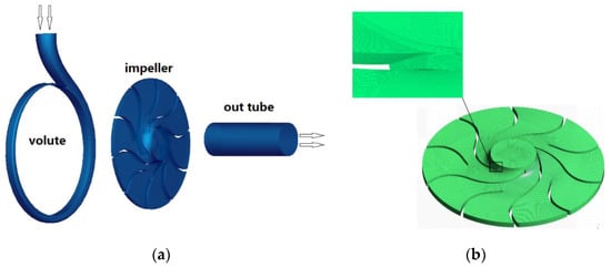A modified PAT with specific speed (nQ1/2/H3/4, where n is rotational speed, Q is flow rate, and H is head) 9.1 was selected for numerical simulation, and the hydraulic parameters were 50 m for head and 50 m3/h for flow rate with the rotational speed 1500 r/min. The flow zones consisted of volute, impeller, and draft tube as shown in Figure 3. The main geometrical parameters were shown in Table 1.